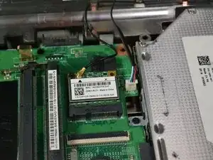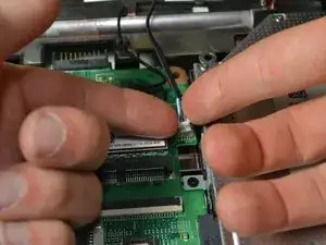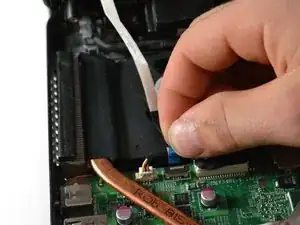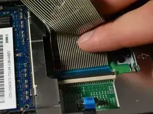 Поднимите нижнюю сторону клавиатуры и найдите ленточный кабель, соединяющий клавиатуру с материнской платой.