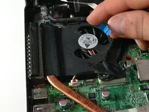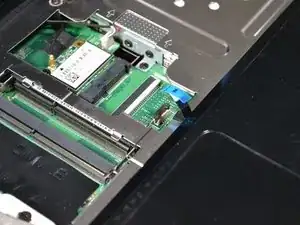 Отсоедините синий язычок, расположенный прямо над тачпадом ноутбука.