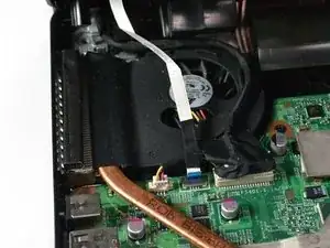 Поднимите чёрный фиксатор на разъёме и аккуратно вытяните ленточный кабель из разъёма, расположенного параллельно материнской плате.