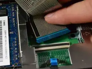 Поднимите клавиатуру и снимите её с материнской платы. Отсоедините синий конец ленточного кабеля от разъёма.