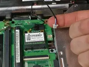 Отсоедините белый разъём проводов — это правый по расположению разъём, соединяющий накладку с корпусом ноутбука.