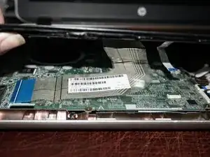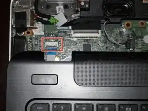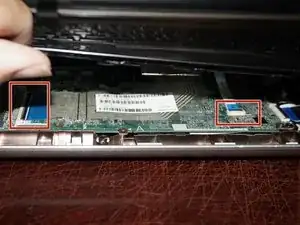 Проведите пластиковым инструментом по всем 3 сторонам поддона для рук. Когда они ослабнут, отключите клавиатуру и тачпад. Поднимите черные пластиковые защёлки на разъемах и отсоедините кабели.