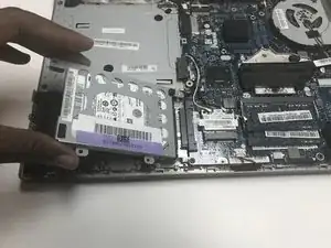 Поднимите внешний конец жесткого диска и сдвиньте его из разъема, чтобы отключить от материнской платы.