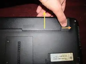 Извлеките аккумулятор из ноутбука. Для этого разблокируйте аккумулятор в корпусе, затем удерживайте защёлку с пружинным фиксатором, одновременно вынимая аккумулятор из ноутбука.