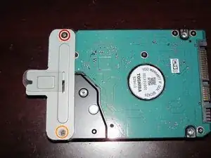 Снимите монтажный кронштейн жесткого диска. Ослабьте 2 отмеченных винта, чтобы отделить диск от кронштейна.