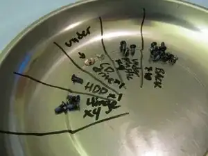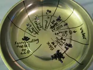 После снятия там находятся 4 винта под пластиком, которые нужно удалить. Посмотрите изображение, чтобы найти их все. Поместите их в органайзер для винтов.