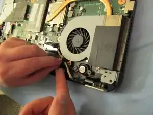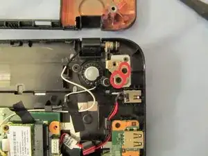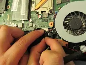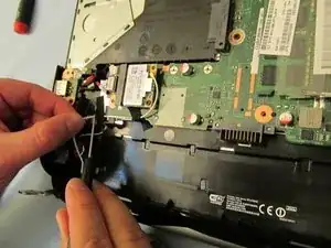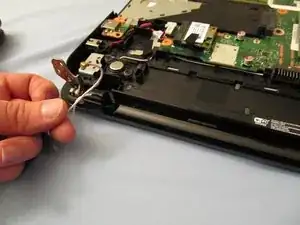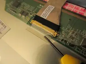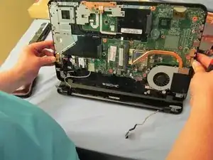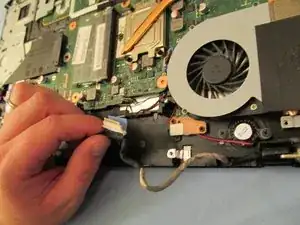 Снова откройте ноутбук, дном к себе, и сдвиньте часть материнской платы от себя. Это отсоединит её от блока LCD, который мы собираемся извлечь.