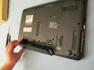 Снимите пластиковую крышку, закрывающую жесткий диск и оперативную память. Для этого ослабьте (не полностью выкручивая) один винт на большой пластиковой детали.