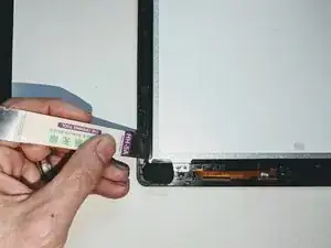 Используя плоский металлический инструмент для вскрытия, осторожно подденьте ЖК‑панель, вставляя клинья по мере продвижения, чтобы предотвратить повторное склеивание дисплея с дигитайзером.