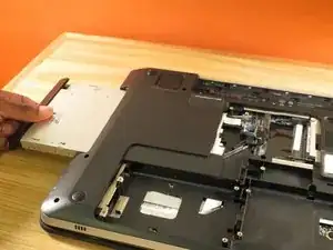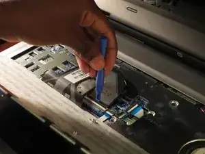 Используйте лопатку, чтобы нажать на металлическую защёлку под местом, где был винт. Это отсоединит оптический привод от SATA‑разъёма.