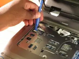 Используйте край пластиковой лопатки, чтобы осторожно перевернуть фиксирующую планку ZIF‑разъёма клавиатуры.