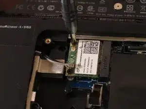 Используйте край пластиковой лопатки, чтобы осторожно поддеть антеннный кабель Wi‑Fi и отсоединить его от слота на беспроводной карте.