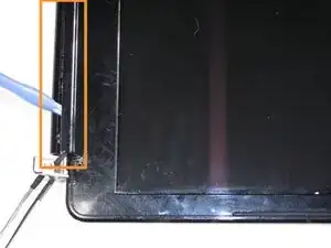 Используйте монтажный инструмент, чтобы осторожно согнуть пластик вокруг рамки монитора и освободить защёлки, удерживающие корпус дисплея вместе.