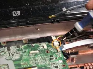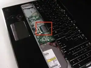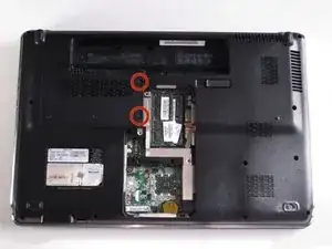 Снимите винт 3 мм, который крепит модуль WLAN к корпусу. (Край модуля, противоположный слоту, приподнимается от корпуса.)