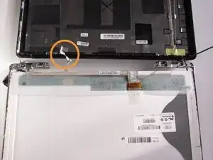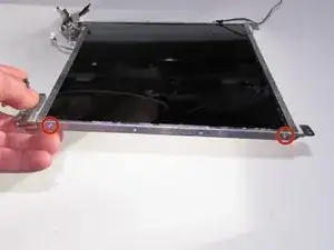 Снимите два крестовых винта 5 мм, которые крепят петлю дисплея к панельному модулю дисплея.