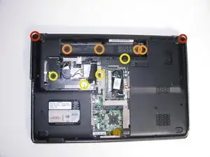 Переверните ноутбук крышкой вниз и найдите три группы винтов, которые крепят клавиатуру и крышку переключателей.