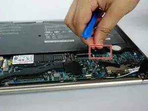 Используйте пластиковый инструмент для вскрытия, чтобы поддеть заднюю панель ноутбука.