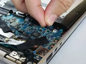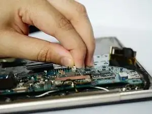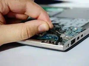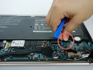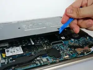 С помощью пластикового инструмента для вскрытия подденьте вентилятор и снимите его с ноутбука.