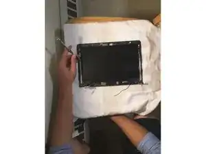 Аккуратно отогните ЖК-дисплей, который всё ещё соединён с устройством, через шарниры так, чтобы он лёг рядом с панелью экрана.