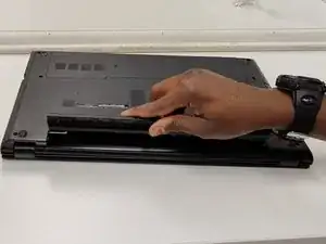 Удерживая левую кнопку, используйте правый палец, чтобы поднять батарею из ноутбука.