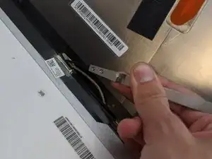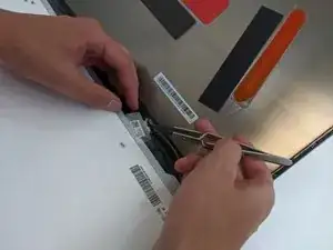 На задней стороне ЖК отключите кабель ЖК с помощью пинцета.
