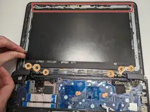 С помощью инструмента для открытия iFixit аккуратно подденьте между рамкой верхней крышки и поднимите вверх.
