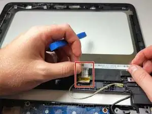 Найдите соединение кабеля ЖК в нижней части дисплея и отогните ленту, фиксирующую кабель.