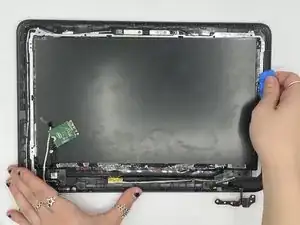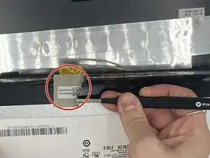 Затем вставьте медиатор IFixit в зазор между ЖК и корпусом экрана и аккуратно подденьте ЖК, слегка надавливая на медиатор, чтобы отделить ЖК от корпуса экрана.