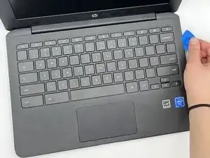 После удаления всех крепёжных элементов в нижней части ноутбука вставьте медиатор IFixit в зазоры между клавиатурой и корпусом по всему периметру клавиатуры. Делая это, лёгко надавливайте на медиатор, чтобы приподнять клавиатуру и открыть ноутбук.