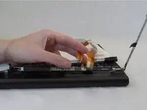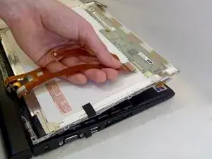 Отсоедините оранжевый кабель ЖК-экрана от небольшой платы возле клавиатуры ноутбука.
