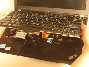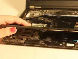 Используя металлическую лопатку, поместите её между тачпадом и клавиатурой и приподнимите, чтобы снять клавиатуру и тачпад.