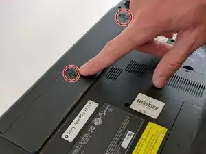 Разблокируйте аккумулятор и сдвиньте рычаг фиксации, чтобы извлечь аккумулятор из ноутбука.