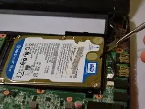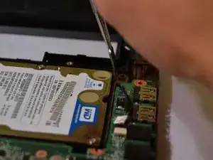 Используйте пластиковый инструмент, чтобы приподнять правый задний угол жёсткого диска