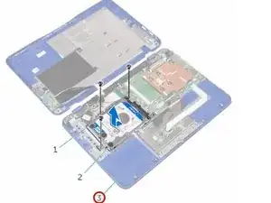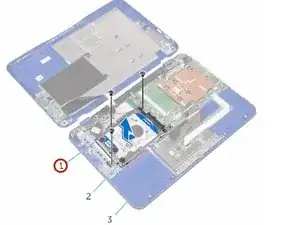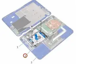 Удалите винты, которые крепят сборку жёсткого диска к подложке и сборке клавиатуры.