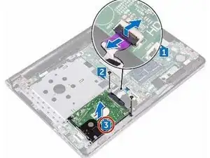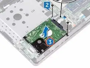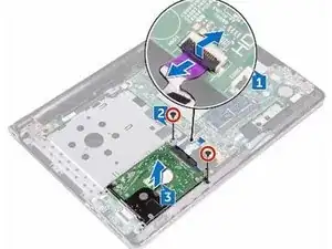 Удалите два винта (M2x3), которые закрепляют узел жёсткого диска на сборке подставки для ладоней.