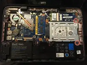 Чтобы удалить старую батарею из ноутбука, сначала открутите восемь винтов (размер M2.5x8) на дне с помощью отвертки Phillips #0, это позволит снять клавиатуру и переднюю панель.