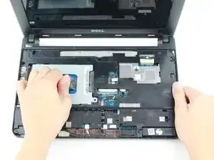 Осторожно снимите панель для рук с основания компьютера, так как она всё ещё подключена кабелем — чтобы избежать повреждений панели.