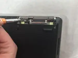 Отверткой Phillips #00 выкрутите два винта размером 2,5 мм × 5 мм, расположенных в переднем левом углу ноутбука.