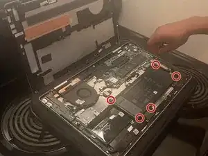 Отверткой Phillips открутите восемь винтов 5 мм на нижней крышке ноутбука.