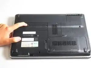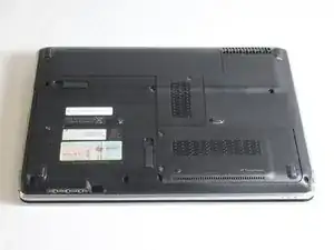 Переверните ноутбук так, чтобы его нижняя часть была направлена вверх, а шарнир находился от вас.