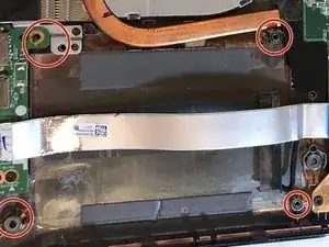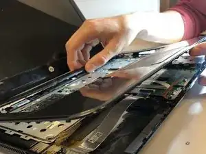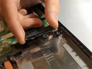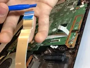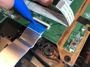 Отключите провод тачпада, перевернув маленький чёрный рычаг с помощью пластикового инструмента для открытия.