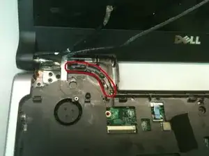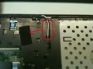 Снимите чёрную тканевую ленту с середины поддона клавиатуры, чтобы открыть антенные провода беспроводной сети, показанные ранее. Отложите эту ленту в сторону.