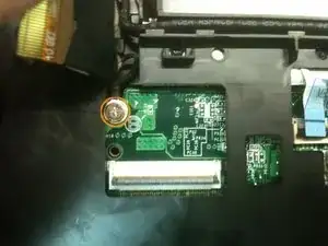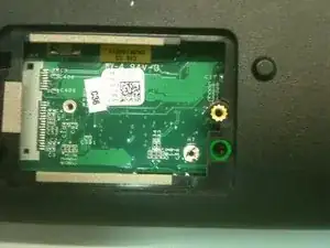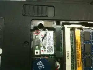 Удалите один маленький винт (2x3 мм), фиксирующий беспроводную карту. Извлеките беспроводную карту из разъёма, потянув её наружу и отложите в сторону.