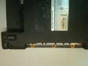 Переведите фиксатор батареи в положение «разблокировано» и извлеките батарею — вы увидите три серебристых крестообразных винта (длина 5 мм). Удалите их.