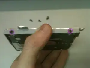 Удалите 4 длинных винта (2,5×5 мм), фиксирующих каркас жёсткого диска к корпусу ноутбука.