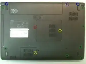 НЕ удаляйте 2 (синих) винта, отмеченных буквой «D» — они предназначены для петель LCD. Снимите 8 длинных винтов (2.5x5 мм) (зелёные) с нижней крышки. Удалите 1 (розовый) винт и запомните, что при сборке он вкручивается в другое время.