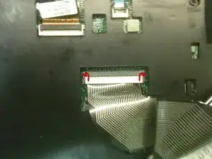 Когда все защёлки будут освобождены, НЕ снимайте накладку полностью — сначала нужно отсоединить небольшой ZIF-кабель от кнопки питания.