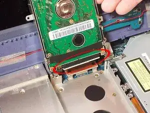 Медленно отведите жёсткий диск от ленточного кабеля, удерживая пластиковый разъём на конце ленты и тянув жёсткий диск. Жёсткий диск должен полностью освободиться от ноутбука, и на изображении будут видны два соединительных конца.