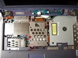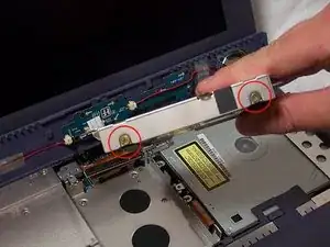 Используйте отвёртку Phillips #00, чтобы отвинтить маленький винт против часовой стрелки. Этот винт крепит аудио/видео разъёмы на левой стороне ноутбука.