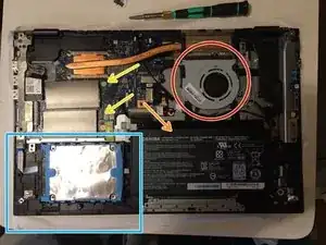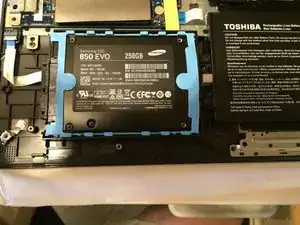 Отсек для 2,5" диска пуст, но разъёмов для подключения нет. По словам Toshiba, это связано с вариациями моделей P55W (как показано в этом руководстве), при этом у всех одинаковая материнская плата и расположение элементов.